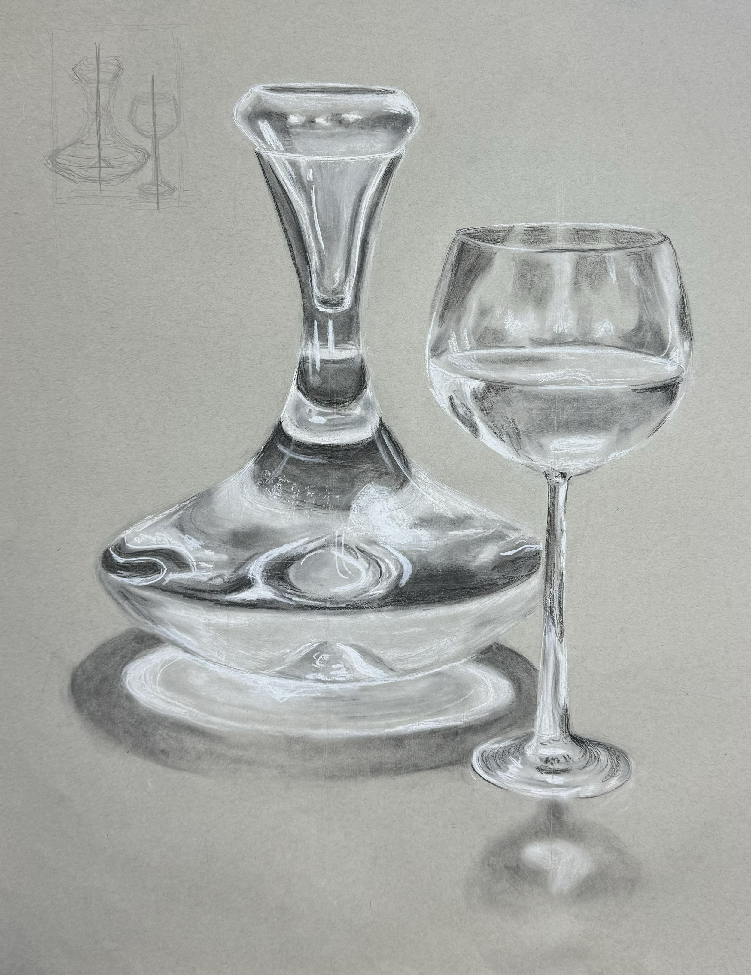 This was a recent study of a decanter and wine glass filled with water I did during my Advanced Art Portfolio Capstone class. Including the thumbnail is intentional, as I like to reveal my thought process. I used vine and compressed charcoal and white pastel to capture the reflections of the overhead light in the water and on the glass.