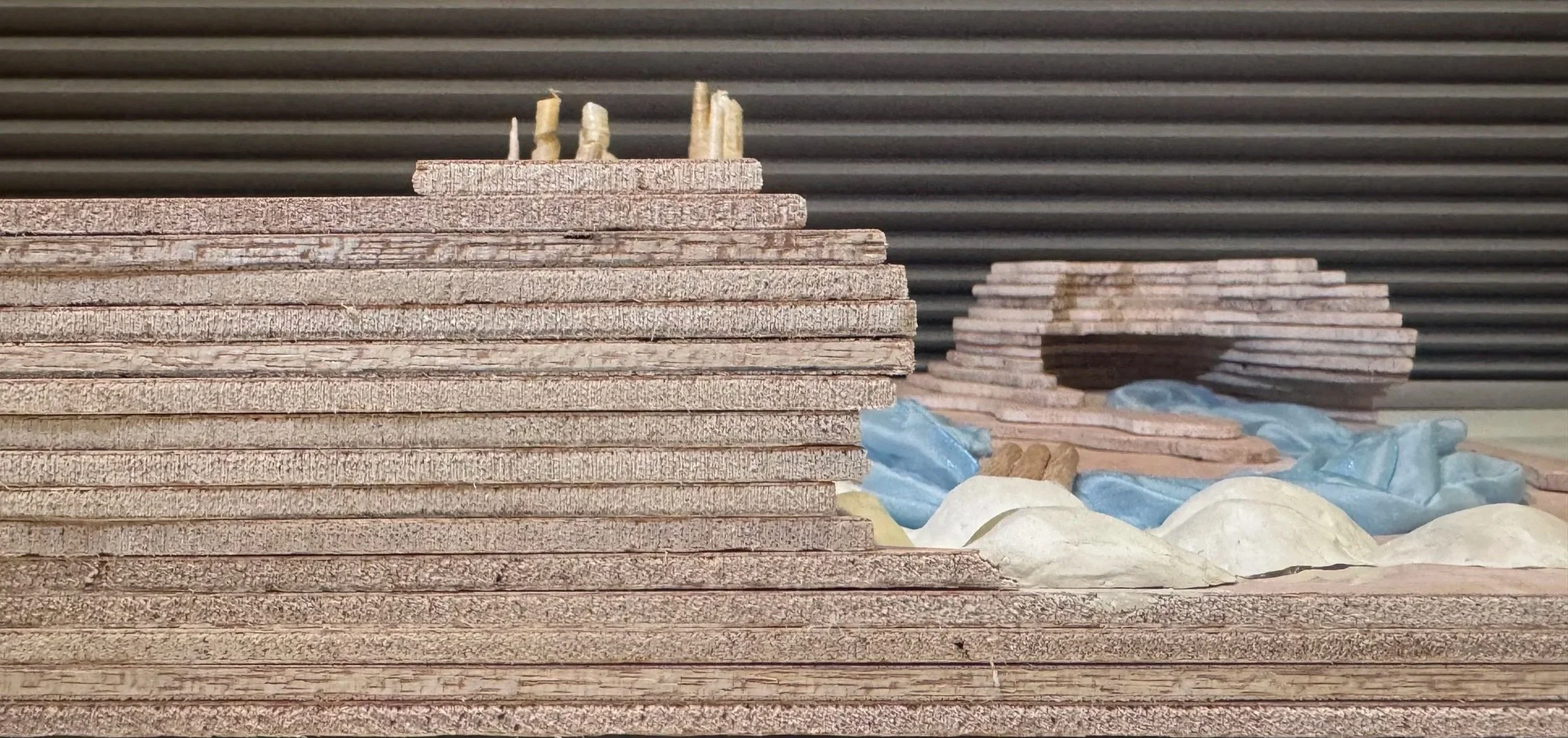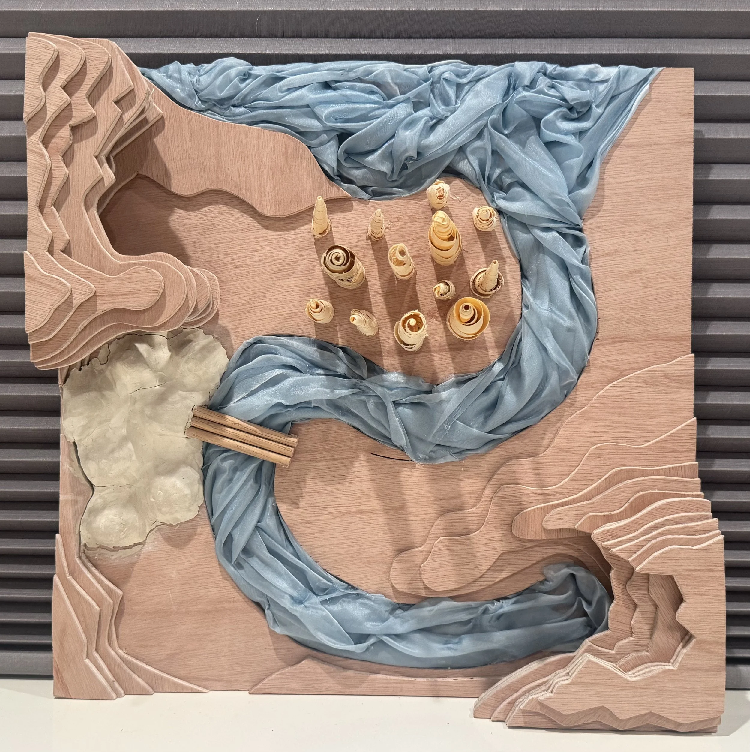 My favorite part of this piece is how tactile it is. The sanded and layered pieces of wood are satisfying to view and to feel, and the twisted fabric river is also visually and texturally interesting. I also appreciate the different perspectives of the map. When viewed from the side, one can see the cave above the river and the arch below the cliff wall that are concealed from an aerial view.