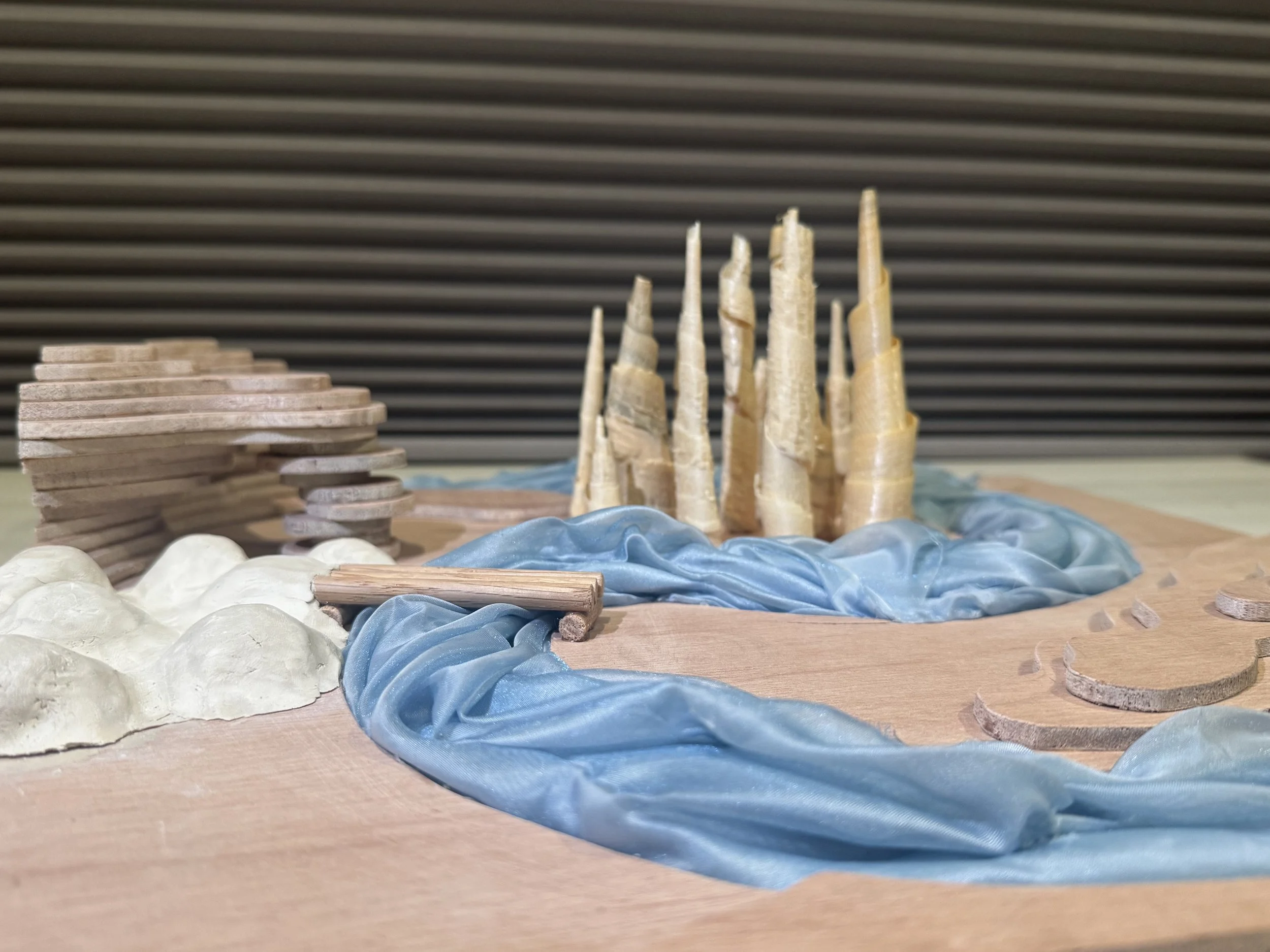 Using saws in the wood shop, I carved and sanded flat pieces of wood into shapes. I created areas of low and high elevation by layering pieces on top of each other. For the river, I twisted and pleated an iridescent fabric to mimic the movement of water. For the neighborhood in the center of the map, I used curled wood shavings to represent a pine tree forest. I chose the cave area and the cliff area to be in opposite corners of the square in order to create a visual frame.