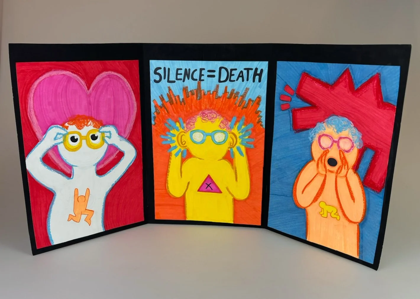 The central figure demonstrates his activism surrounding aids awareness and ending the stigma surrounding aids. The phrase “Silence = Death” comes from his piece, “Ignorance = Fear,” which my triptych is based on. The hands behind the ears tells the viewer that we must still listen, and speak about the topics we believe in.