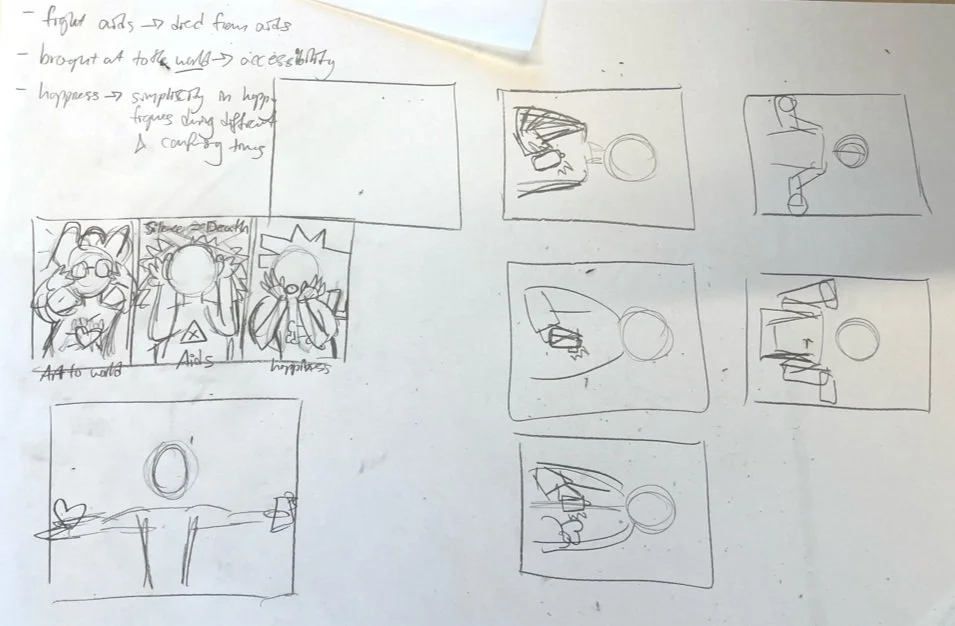 The left figure represents his message of making art accessible for ordinary people. Haring had pop-up shops where he sold his art for relatively cheaper prices than normal, and he regularly drew art on the subway walls. The hands holding glasses surrounding wide eyes embodies the millions of people impacted by his art.