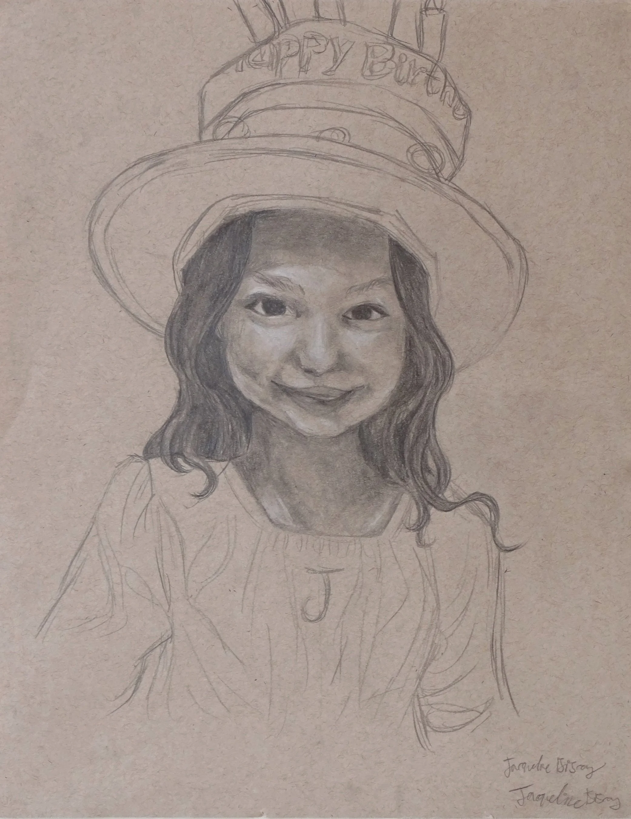 This drawing depicts me on my 8th birthday. The piece encompasses my feelings of nostalgia when looking back at childhood pictures. The mix of the realistic face with the sketched clothing represents the blurriness of memory: some parts are clear while others I can’t quite remember.