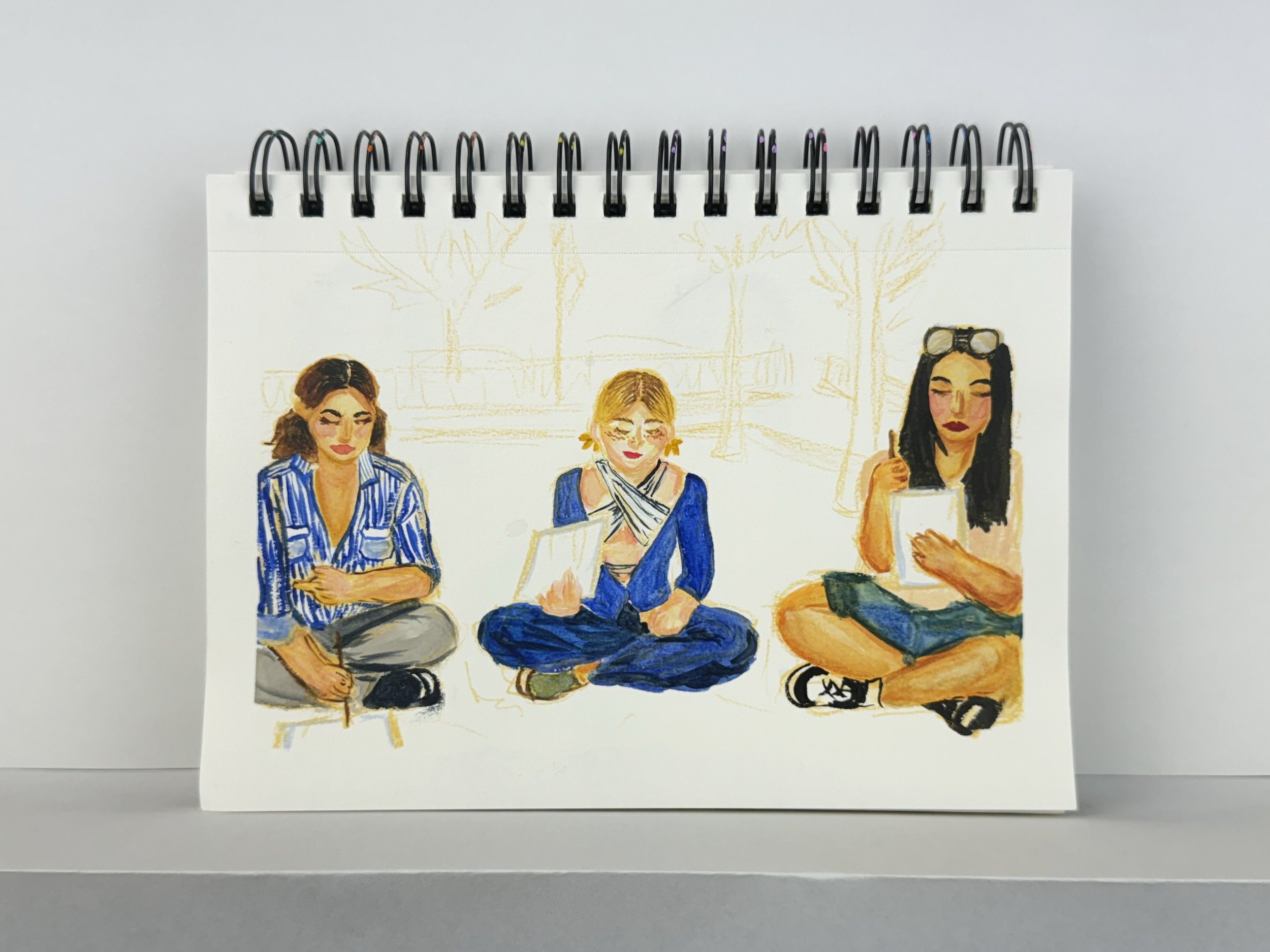 I painted this image during a summer art program I attended in 2024. During an afternoon painting activity, I asked some friends sitting across from me if I could paint them. I felt drawn to exhibit the contrasting colors of the blue and yellow/browns. My favorite part of this painting are the clothes (particularly the stripped shirt), and the calm yet focused expressions on my friend’s faces.