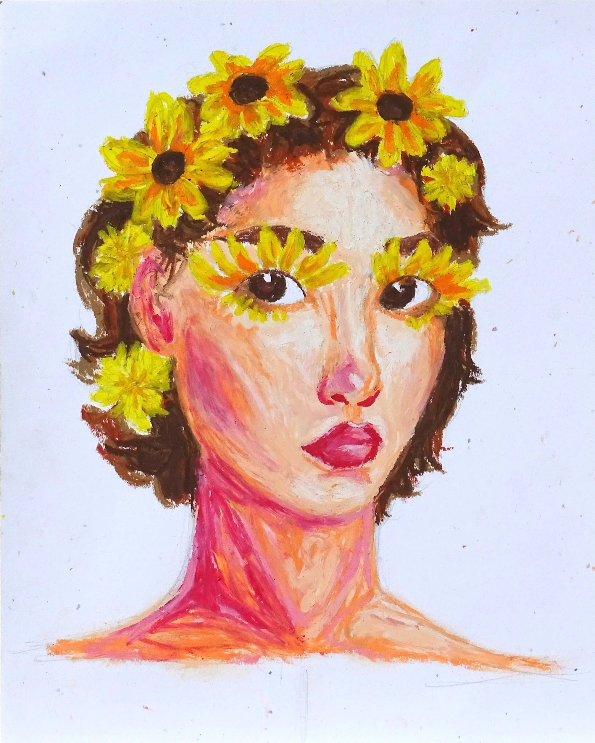 This piece was the expression of a concept I’ve thought about for years: what if we had flower petals for eyelashes? This piece is one of my favorite artworks I’ve created. I love the playful color palette, specifically the interactions between the yellow, orange, pink and brown. I also love the implication that the eye is the center of the flower. I hope to further this idea by overseeing a photoshoot centered on the original concept of flower petal lashes.