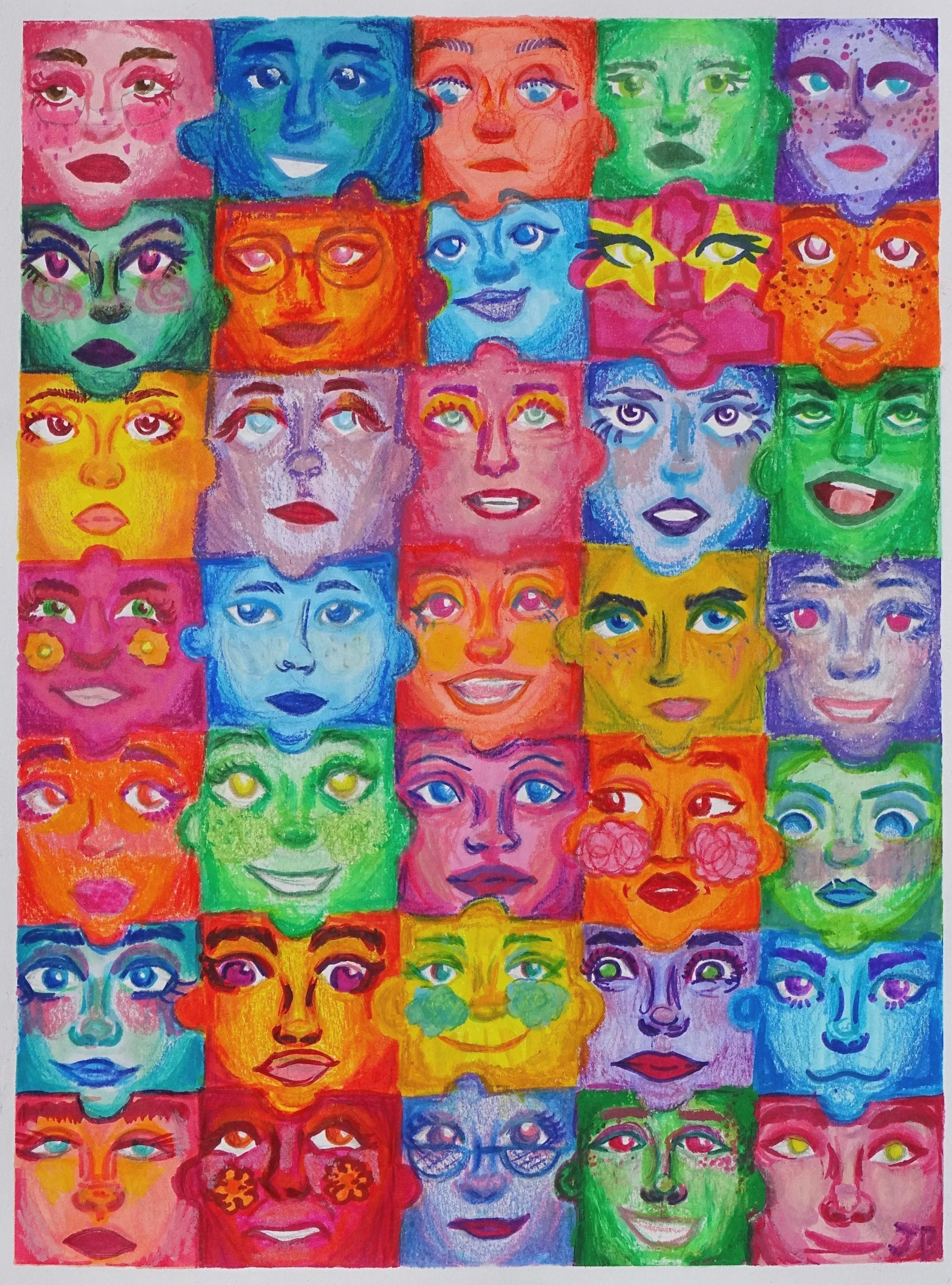 This drawing represents the many people who are a part of my life. I felt inspired by the concept of a puzzle, and made each piece a face to represent how everyone is connected. Each unique puzzle piece has its own core people surrounding it, adding to their story. The faces were inspired by pictures of real people I know.
