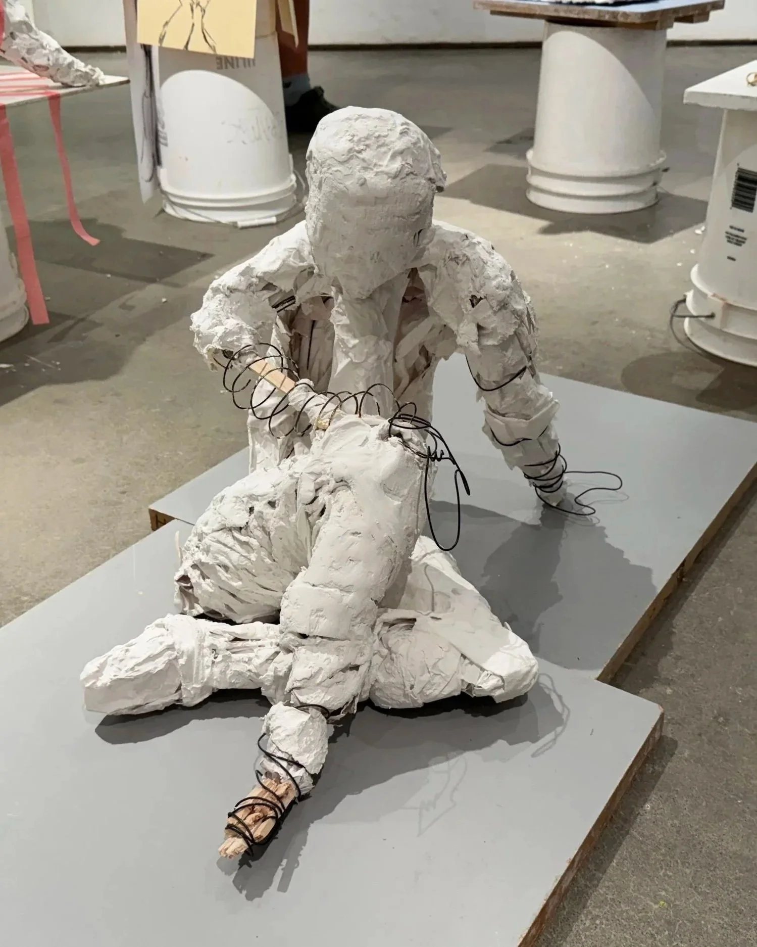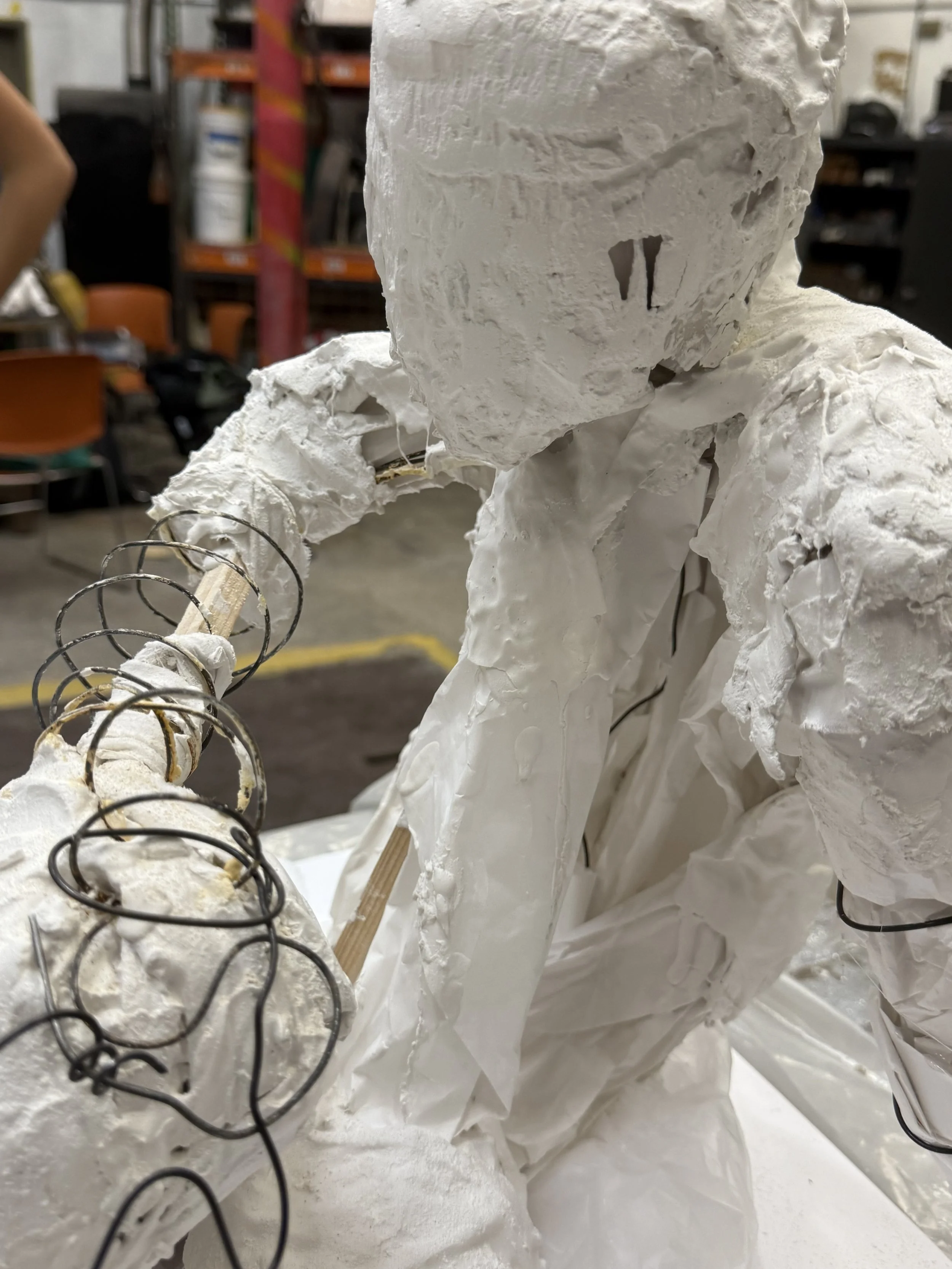 We used plaster and strips of thin cloth to build a hard shell around the amassed paper. I particularly focused on building the back muscles using sand paper and metal tools. We also used wire to outline the shapes of the forearm and hands. The black wire against the white plaster created an interesting contrast.