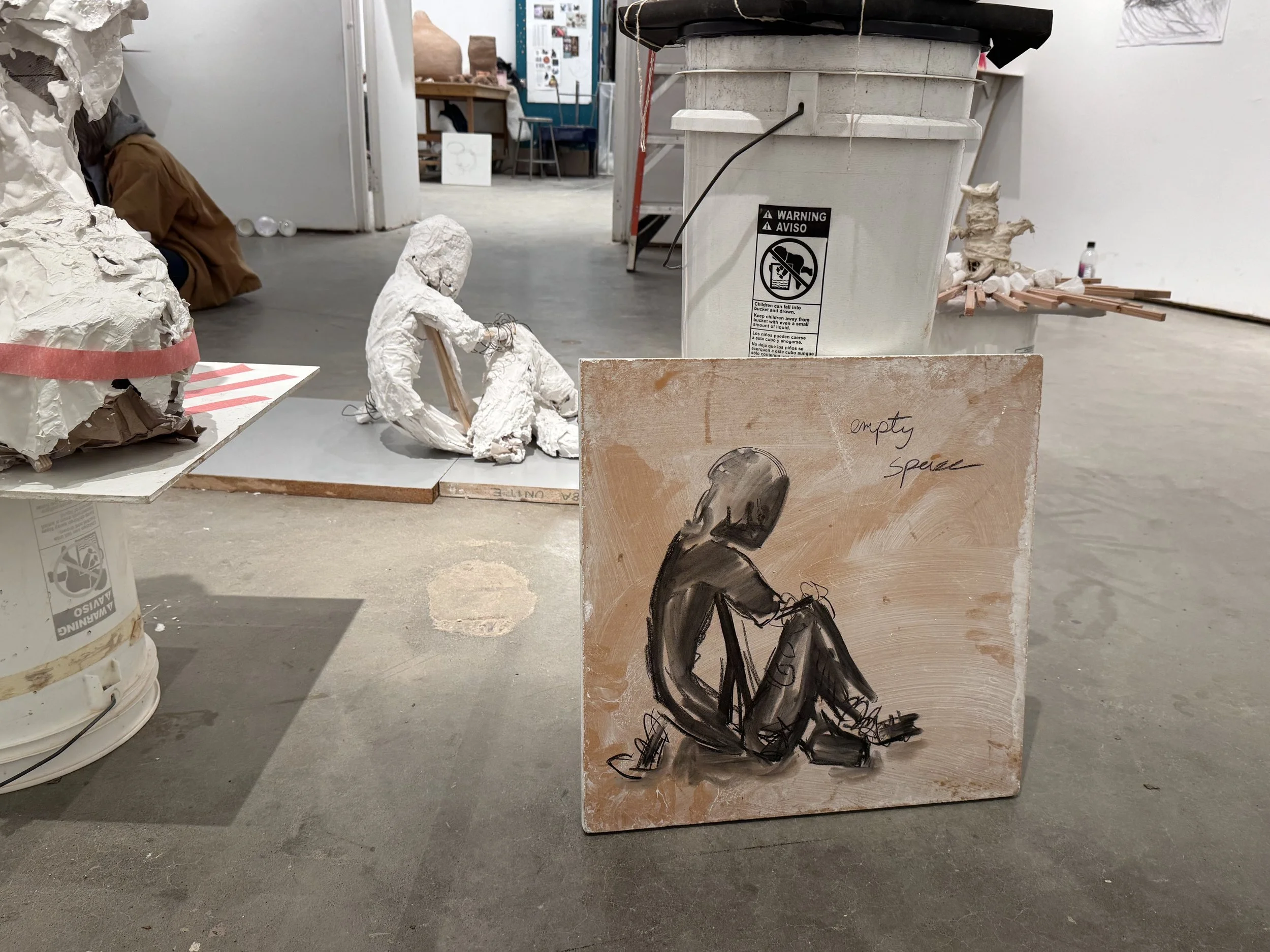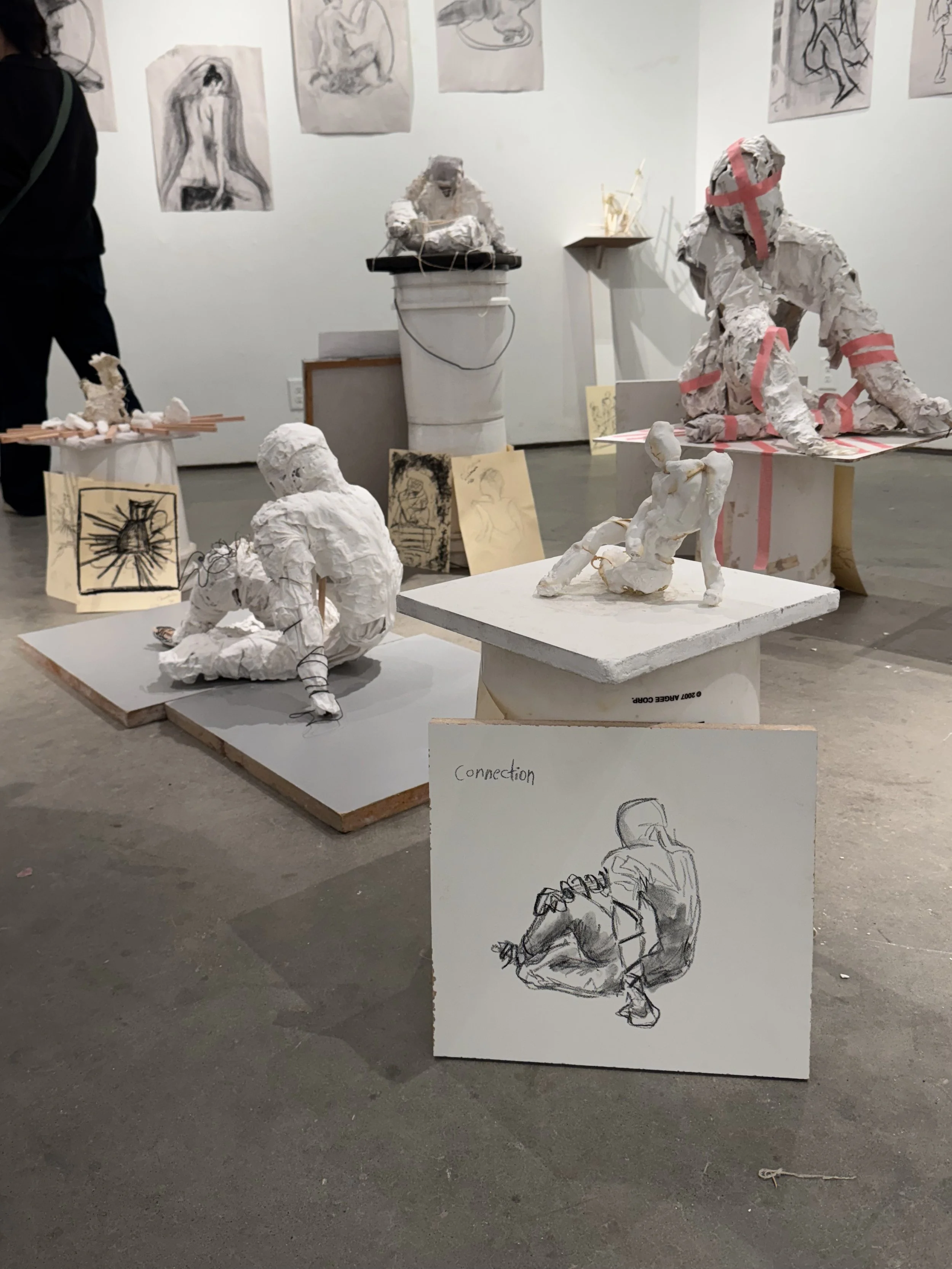 For the exhibit, we created drawings of the sculpture from different angles. We placed our drawings around the center area of the exhibit, so that the viewer would see the drawing and the sculpture at the angle that the drawing was drawn from. I emphasized important aspects of our sculpture by writing the phrases “connection” (in reference to the connections between all the different materials used), and “empty space” (in reference to the gap between the solid back and the interior supports, which highlight the missing torso). Throughout this project, I really enjoyed the interaction between solid forms and the see-through forms made of loose wire.