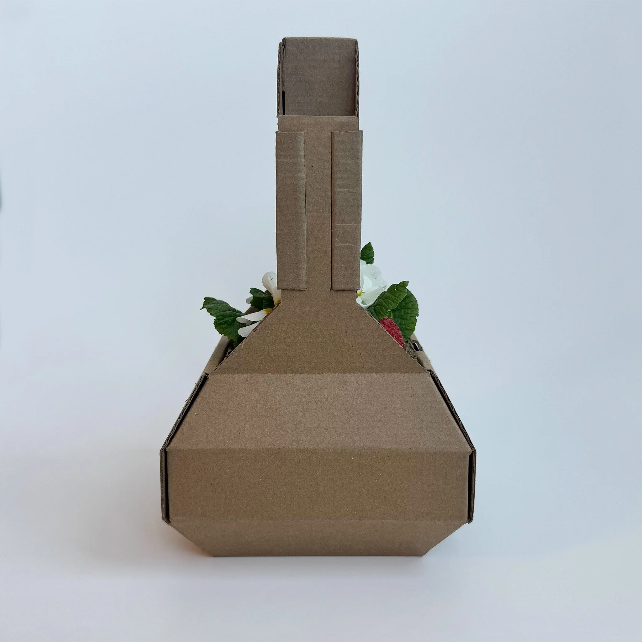 The first piece folds to create the box body, which stays together using hidden extended interlocking tabs on the middle and upper portion of the box sides. There is a semicircle cut out on the box edge, to allow for easy hand access to the plant. On two sides, the box body has extending pieces that act as the handle bars.